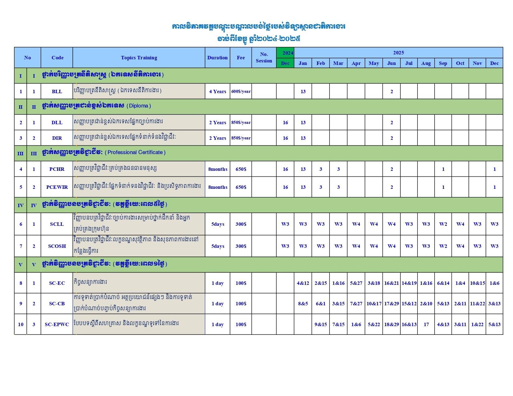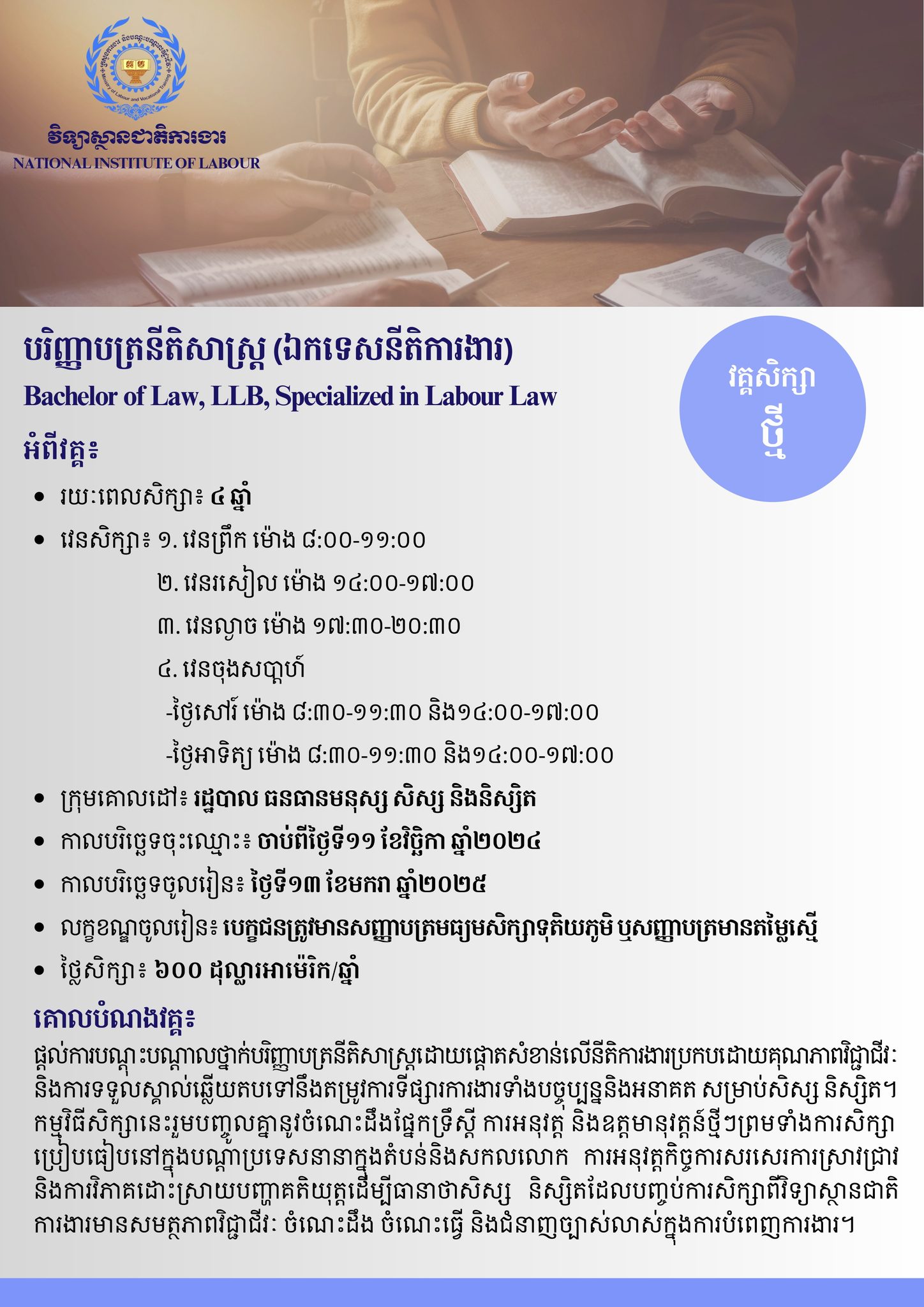 វិទ្យាស្ថានជាតិការងារ (វ.ជ.ក.) នៃក្រសួងការងារ និងបណ្តុះបណ្តាលវិជ្ជាជីវៈដែលបង្កើតឡើងដោយអនុក្រឹត្យលេខ ១១១ អនក្រ.បក ចុះថ្ងៃទី ១ ខែសីហា ឆ្នាំ ២០១៩ គឺជាគ្រឹះស្ថានអប់រំឈានមុខមួយក្នុងការបណ្តុះបណ្តាលលើជំនាញ ច្បាប់និងលិខិតបទដ្ឋានគតិយុត្តក្នុងវិស័យការងារ សន្តិសុខសង្គម នឹងបណ្តុះបណ្តាលវិជ្ជាជីវៈ ក៏ដូចជាជំនាញទន់ ដើម្បីលើកកម្ពស់ចំណេះដឹង និងជំនាញពេញមួយជីវិតប្រកបដោយគុណភាព ប្រសិទ្ធភាព និងវិជ្ជាជីវៈ សំដៅបង្កើន ប្រសិទ្ធភាពការងារ និងធ្វើឱ្យប្រសើរឡើងនូវសុខដុមរមនានៃទំនាក់ទំនងវិជ្ជាជីវៈនៅកន្លែងការងារ។ ជាមួយនេះ វ.ជ.ក. ក៏ដើរតួនាទីយ៉ាងសំខាន់ ក្នុងការផ្តល់ការប្រឹក្សាផ្នែកច្បាប់ពាក់ព័ន្ធនឹងវិស័យការងារ សន្តិសុខសង្គម និងបណ្តុះបណ្តាលវិជ្ជាជីវៈនិងធ្វើការសិក្សាស្រាវជ្រាវជាអាទិ៍ទៅលើលក្ខខណ្ឌការងារ ទំនាក់ទំនងវិជ្ជាជីវៈ ផលិតភាព ការងារសុខភាពនិងសុវត្ថិភាពការងារ។ តាមរយៈគេហទំព័រនេះ យើងជឿជាក់ថា មន្ត្រីរាជការ និយោជក កម្មករនិយោជិត និងសាធារណជនអាចស្វែងរកព័ត៌មានអំពី វ.ជ.ក. វគ្គបណ្តុះបណ្តាល និងបទប្បញ្ញត្តិច្បាប់ពាក់ព័ន្ធនឹងវិស័យការងារ សន្តិសុខសង្គម នឹងបណ្តុះបណ្តាលវិជ្ជាជីវៈ ប្រកបដោយប្រសិទ្ធភាព និងឆាប់រហ័ស។